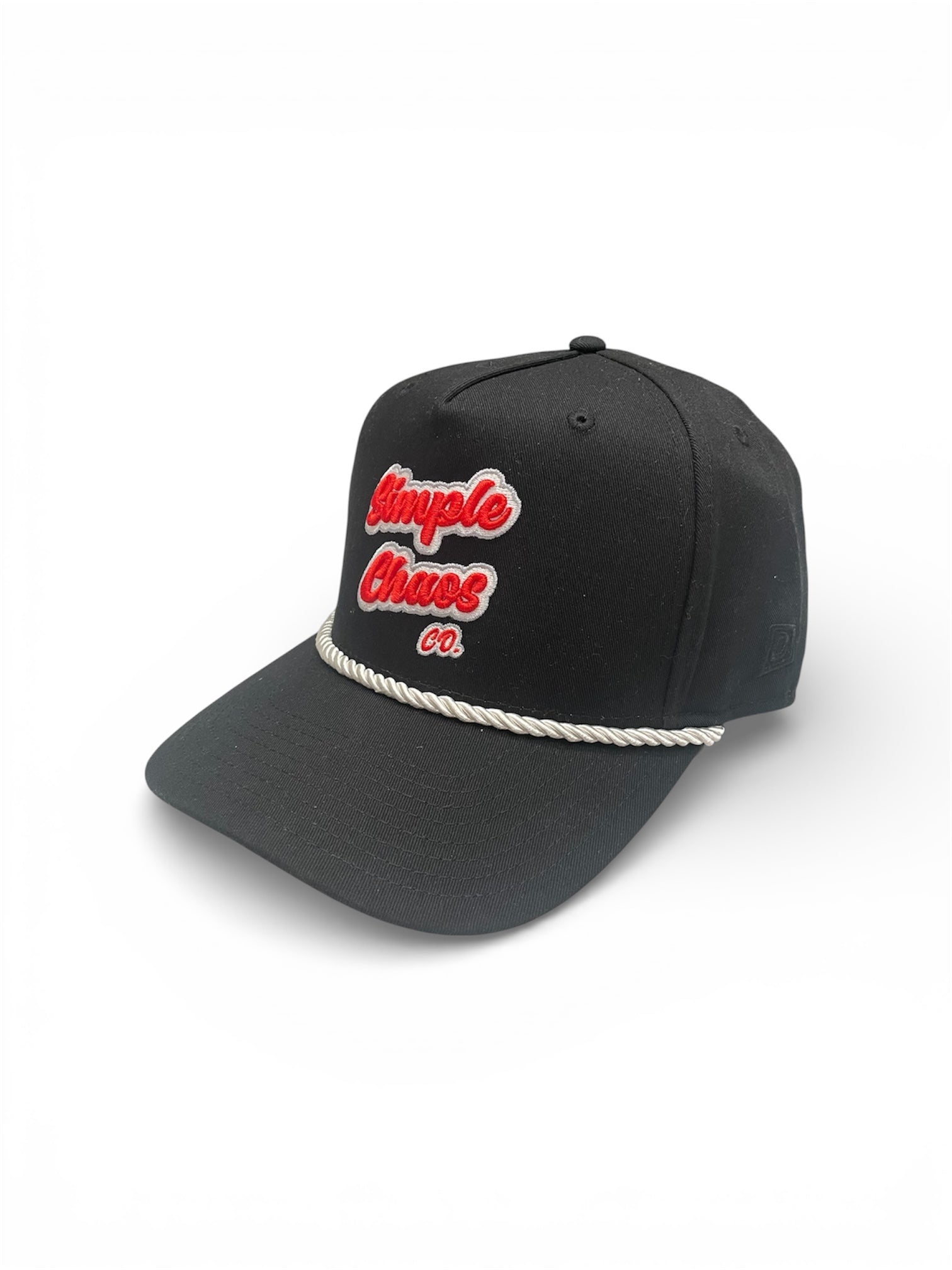 Our Cumberland - Black Red Trucker hat features a raised stitching in red with a white outline, which is complimented by a black background to the hat. It is a 5-panel, structured trucker hat with a white snapback and a white rope across the front.